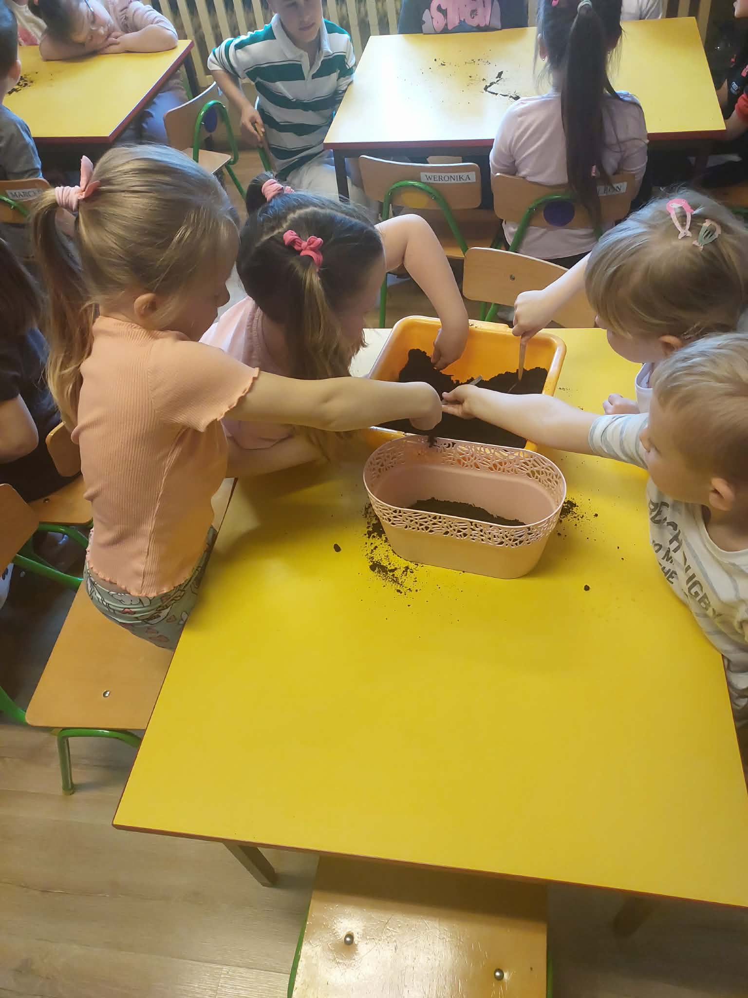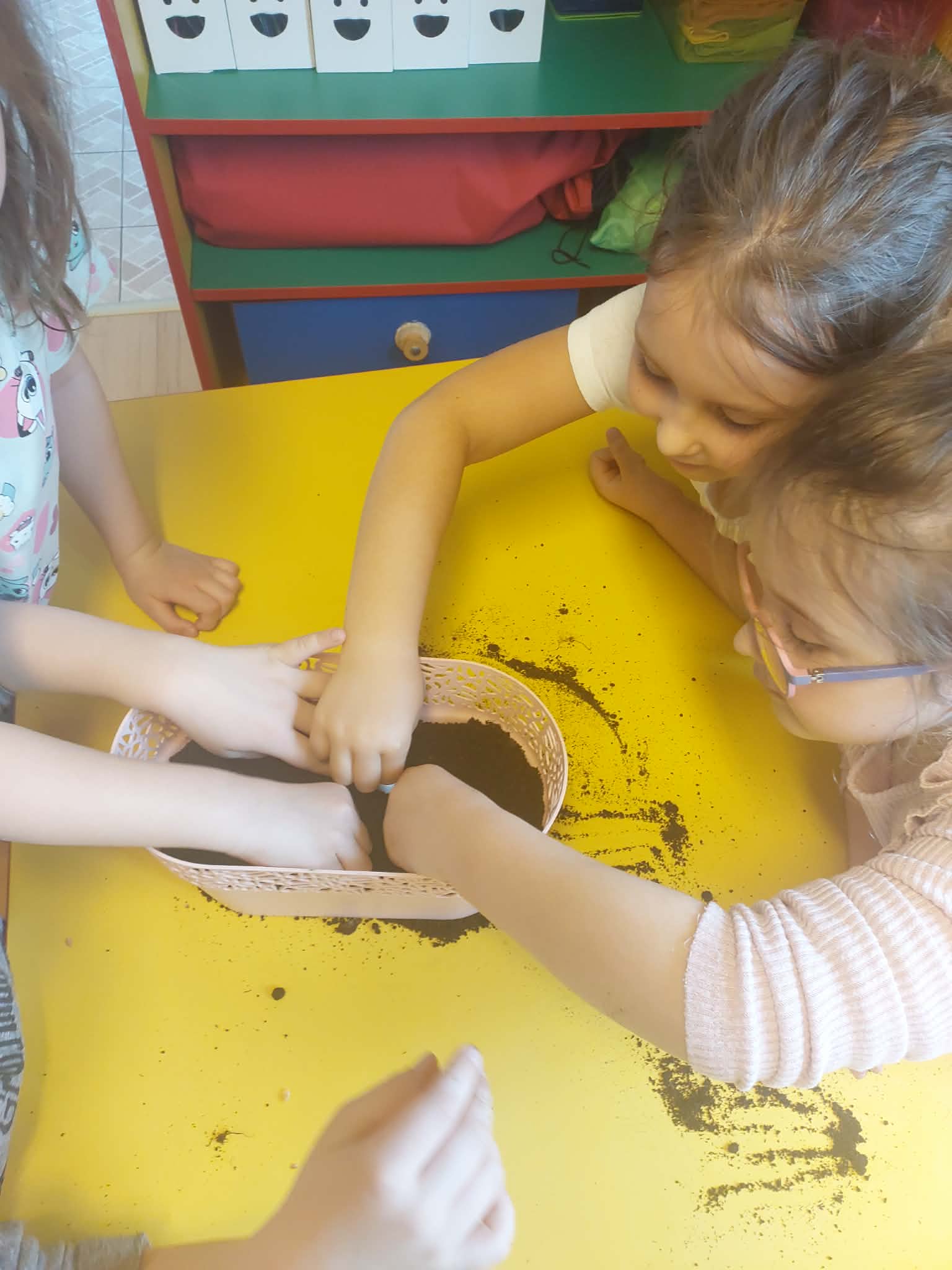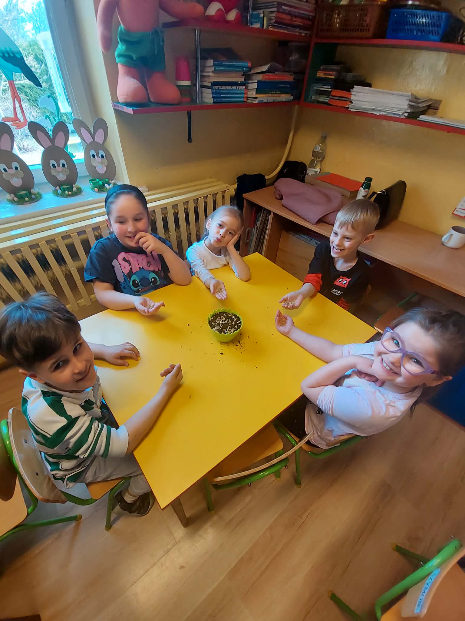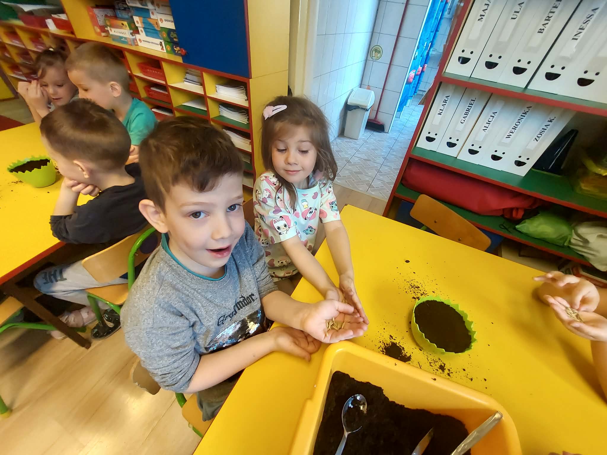 W sali przedszkolnej gr. I dzieci siały owies i rzeżuchę do przygotowanych ozdobnych pojemniczków. Maluszki wzbogaciły wiadomości dotyczące sposobu hodowania wybranych roślin oraz przeżywały pozytywne emocje podczas wspólnej pracy.