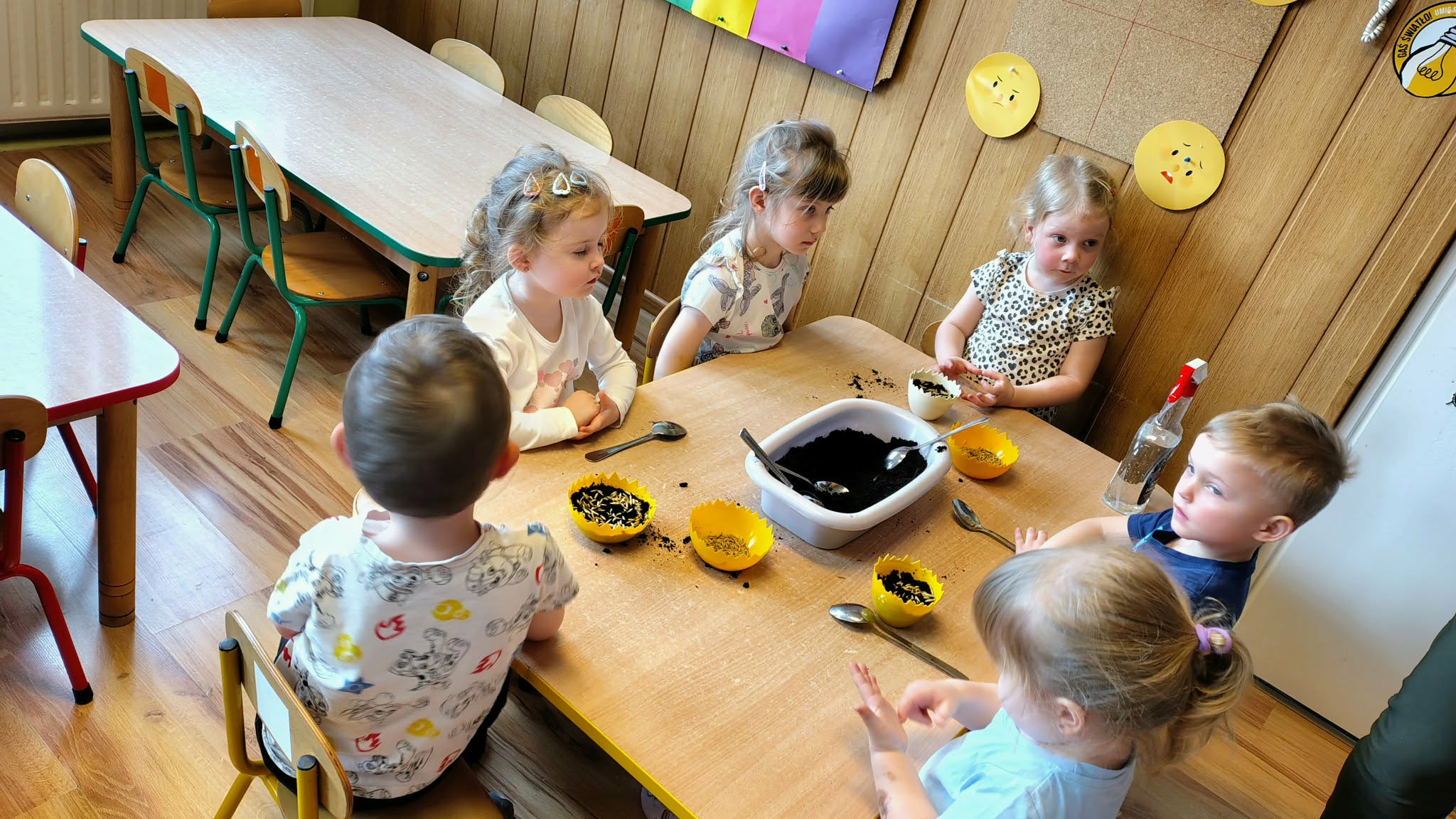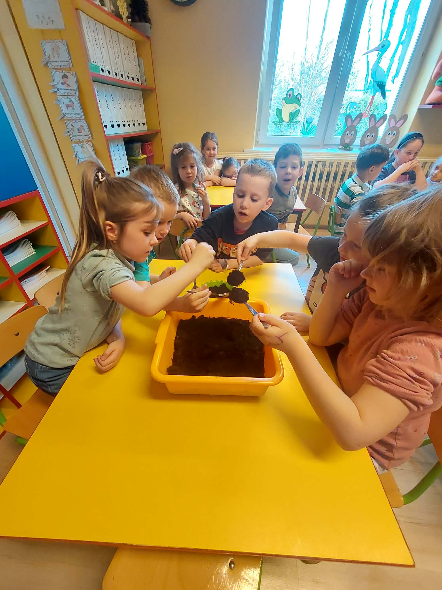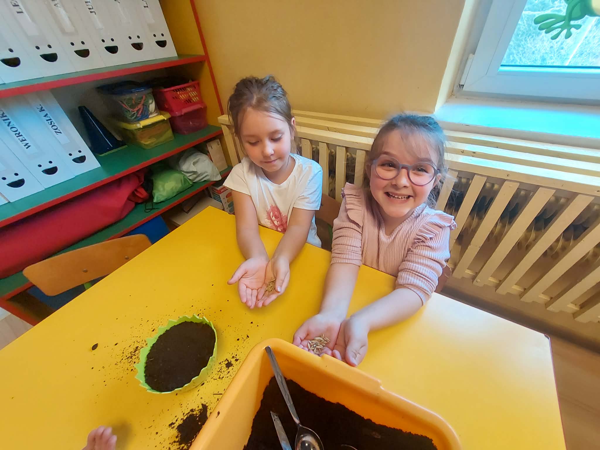 W sali przedszkolnej gr. I dzieci siały owies i rzeżuchę do przygotowanych ozdobnych pojemniczków. Maluszki wzbogaciły wiadomości dotyczące sposobu hodowania wybranych roślin oraz przeżywały pozytywne emocje podczas wspólnej pracy.