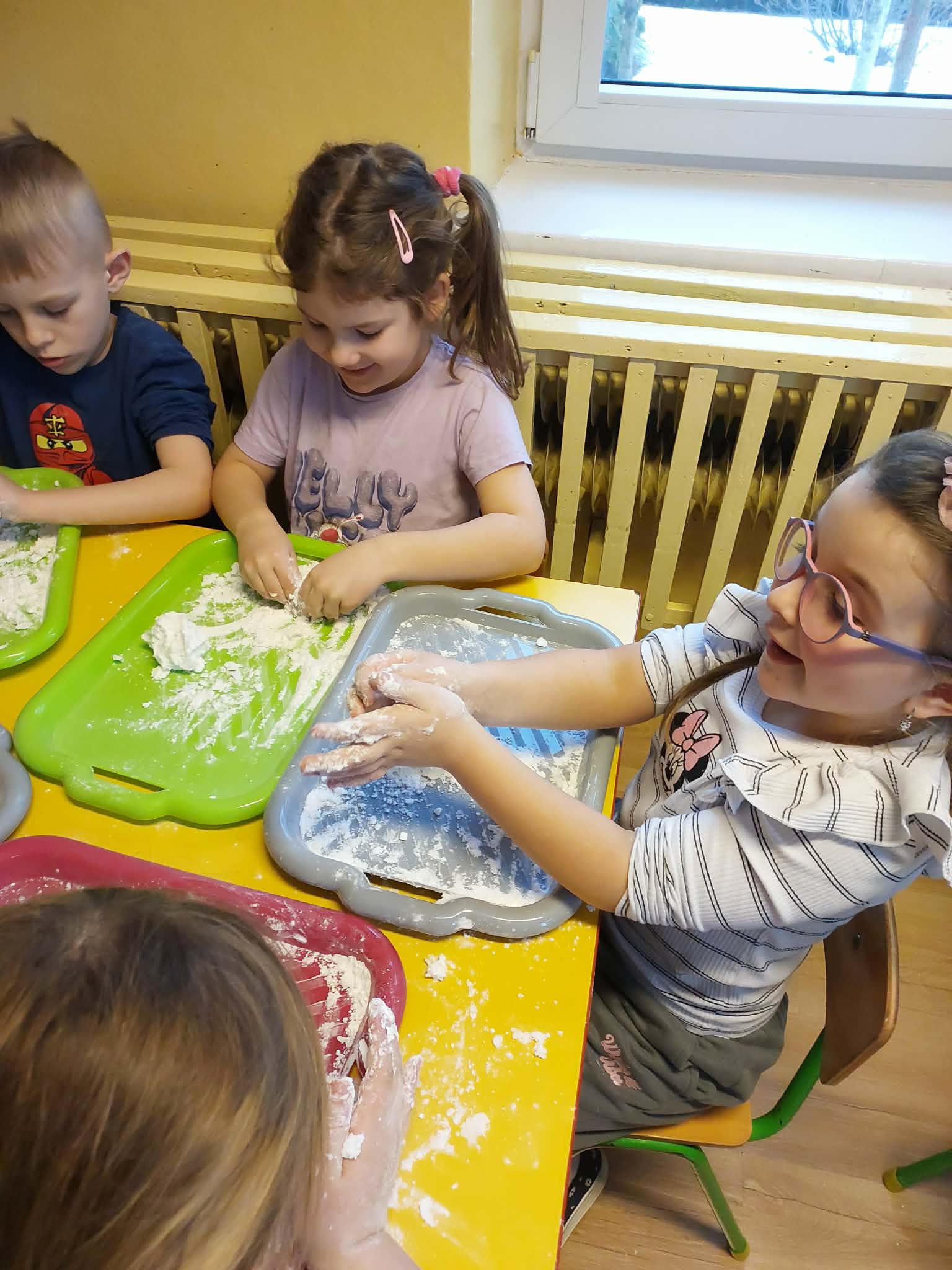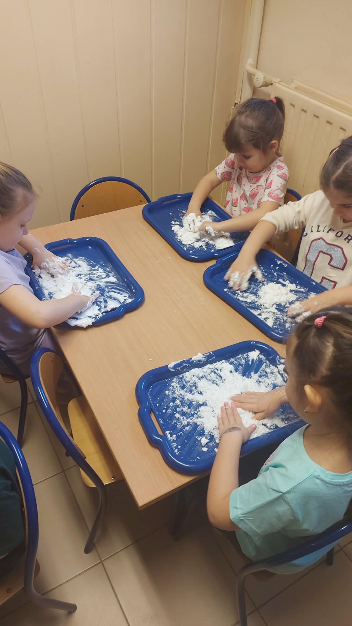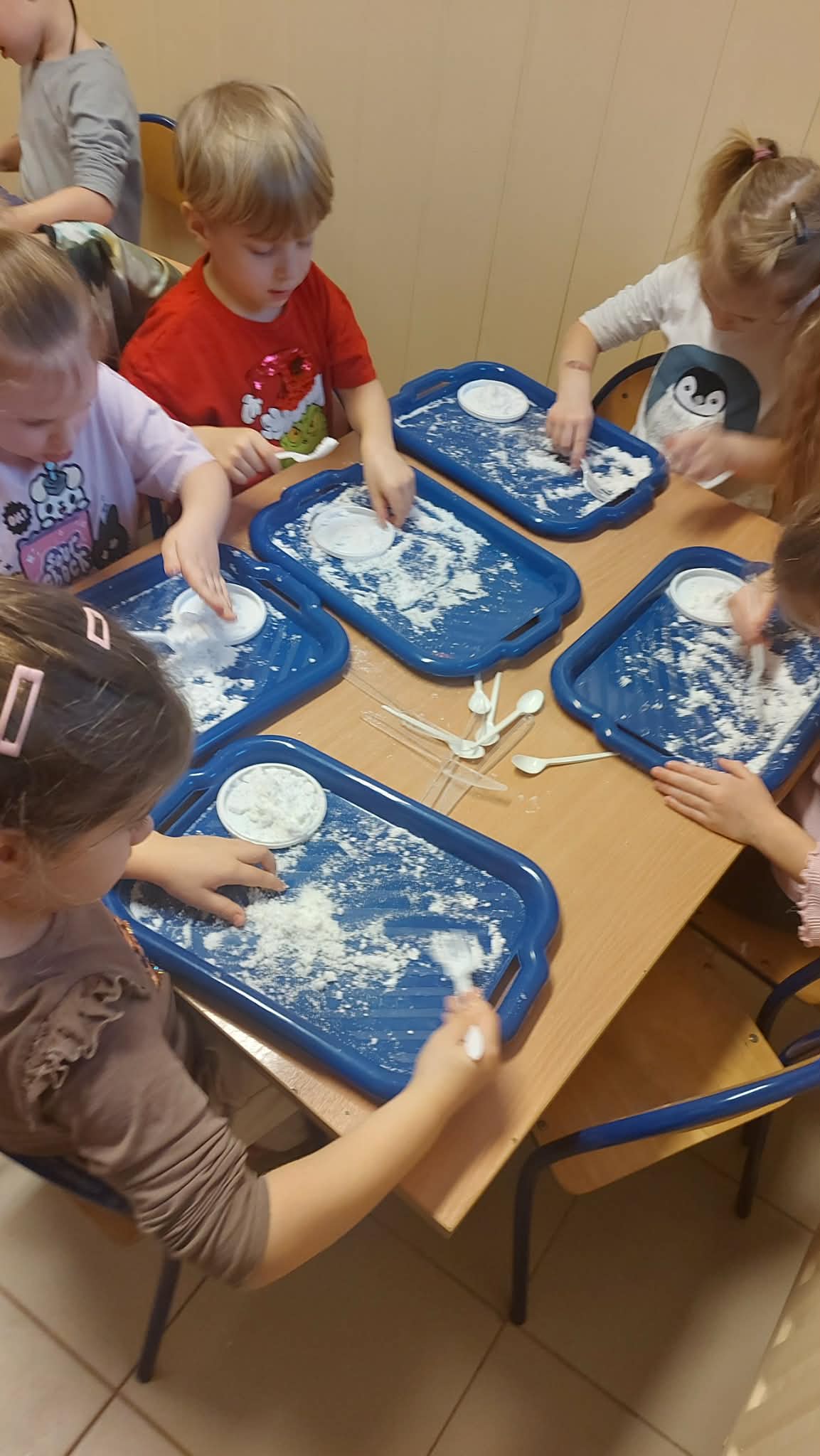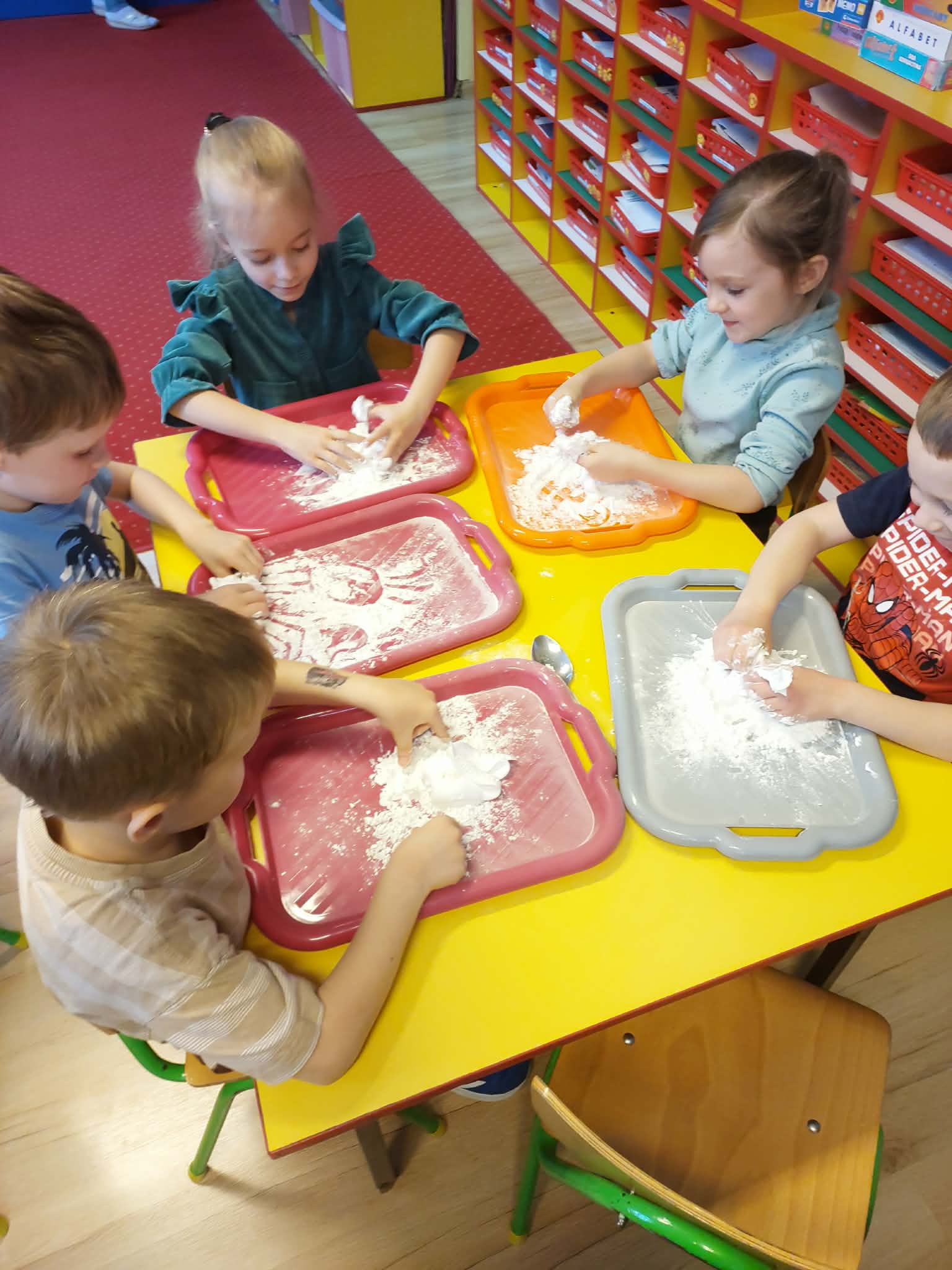 W minionym tygodniu przedszkolaki z grupy II i III wzięły udział w zajęciach sensorycznych podczas których z kilku składników tworzyły sztuczny śnieg. Podzcas ugniatania, lepienia bałwanków dzieci stymulowały zmysły dotyku, wzroku, zapachu i słuchu oraz rozwijały motorykę małą, kreatywność i wyobraźnię.