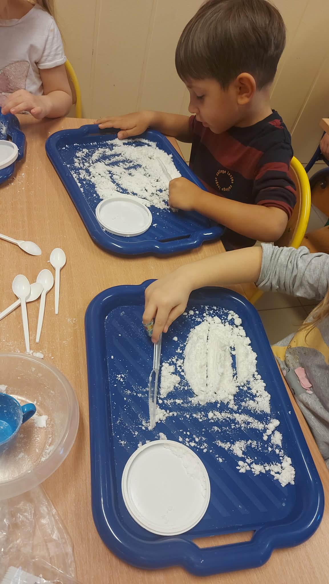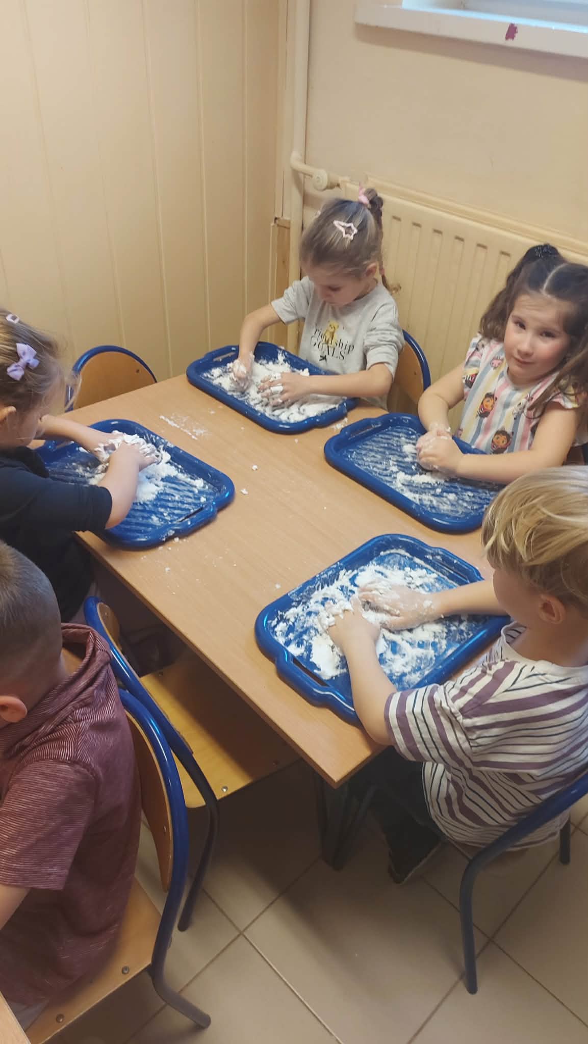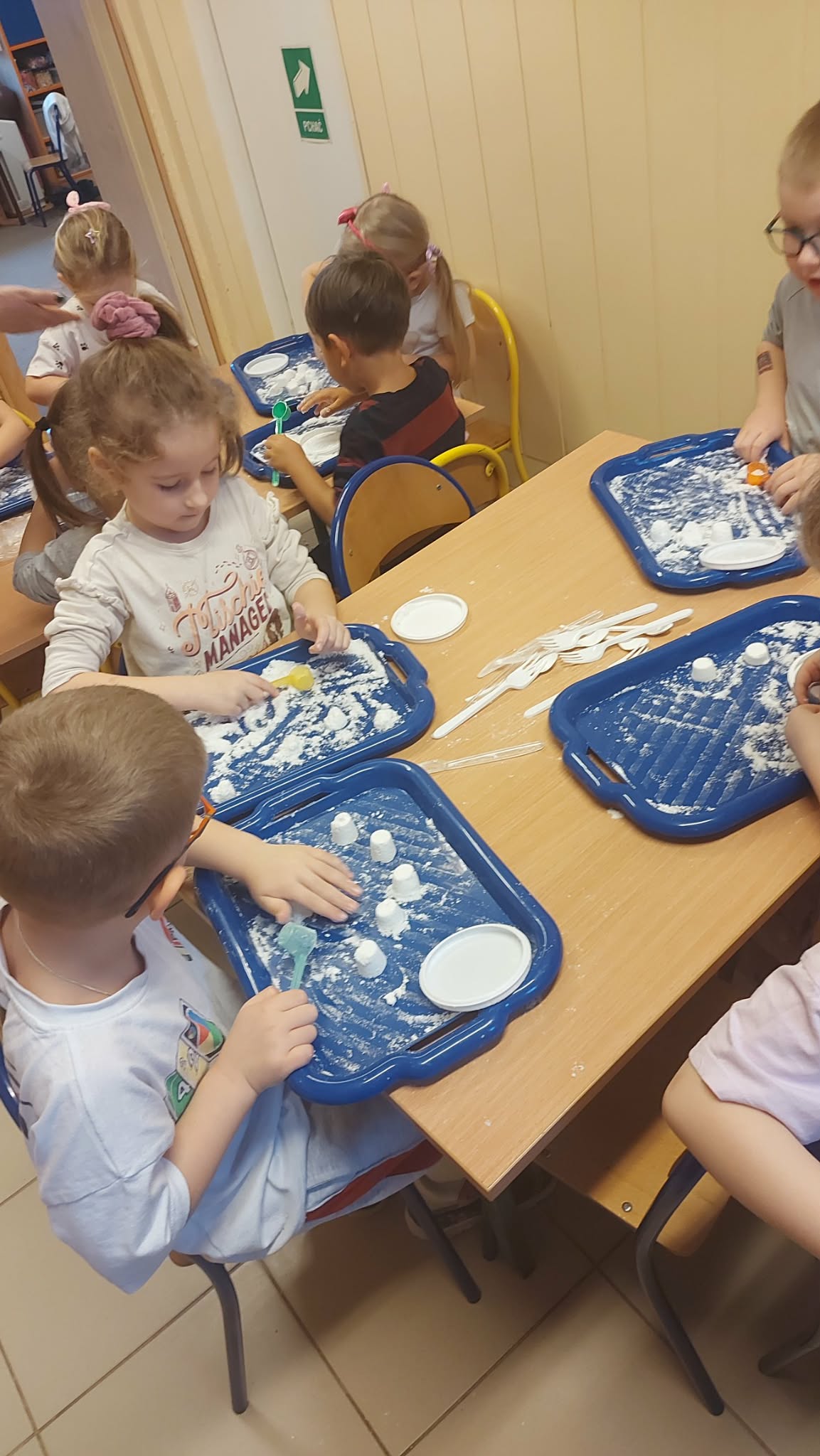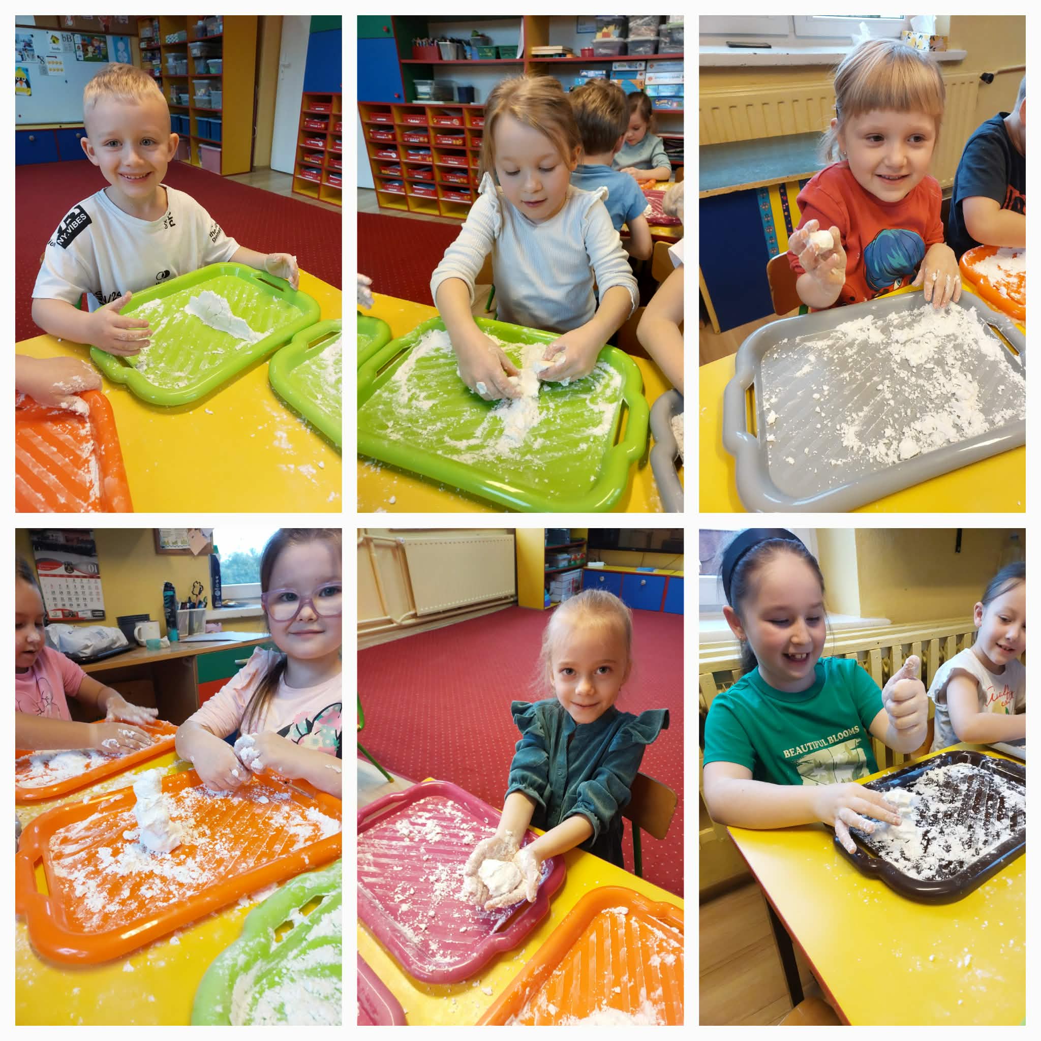 W minionym tygodniu przedszkolaki z grupy II i III wzięły udział w zajęciach sensorycznych podczas których z kilku składników tworzyły sztuczny śnieg. Podzcas ugniatania, lepienia bałwanków dzieci stymulowały zmysły dotyku, wzroku, zapachu i słuchu oraz rozwijały motorykę małą, kreatywność i wyobraźnię.