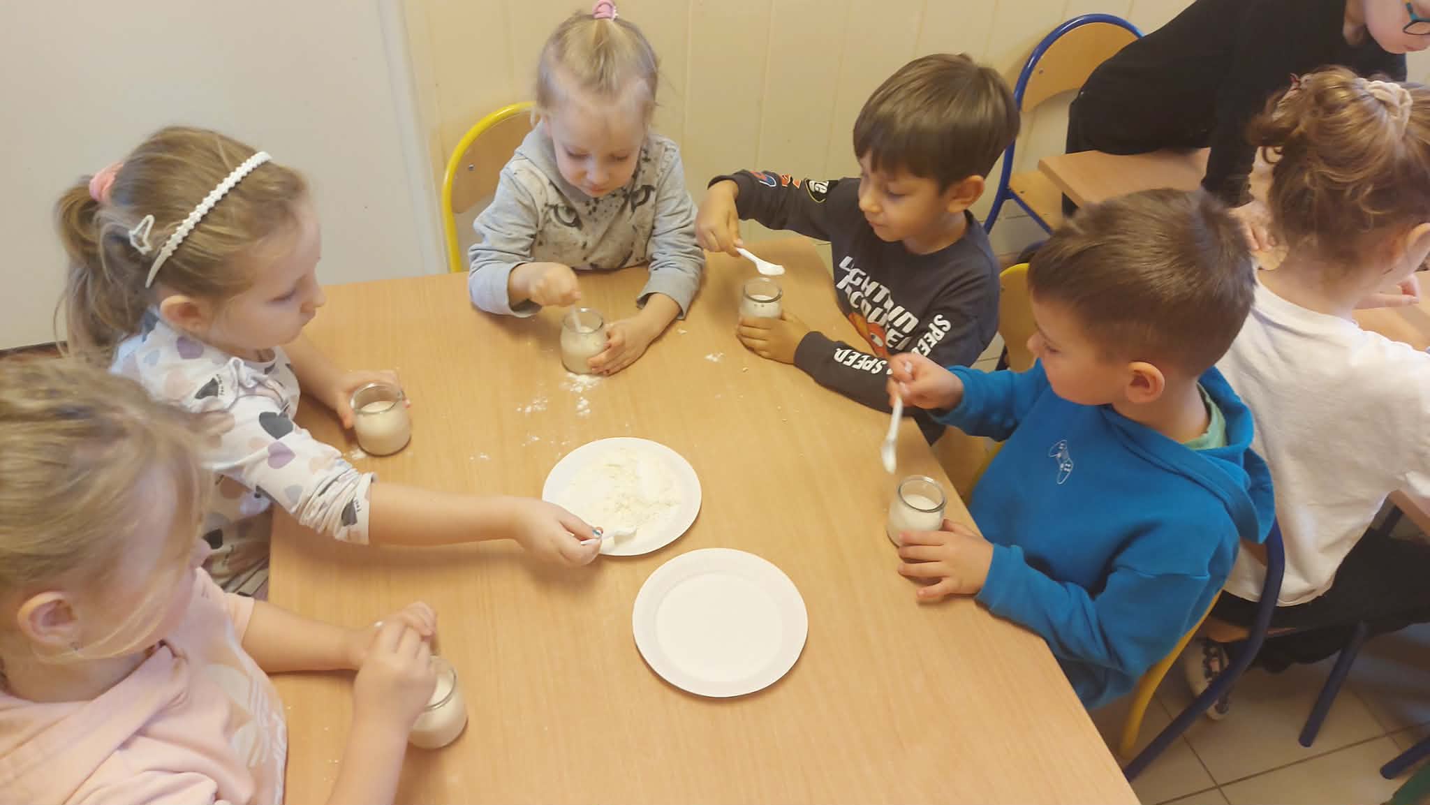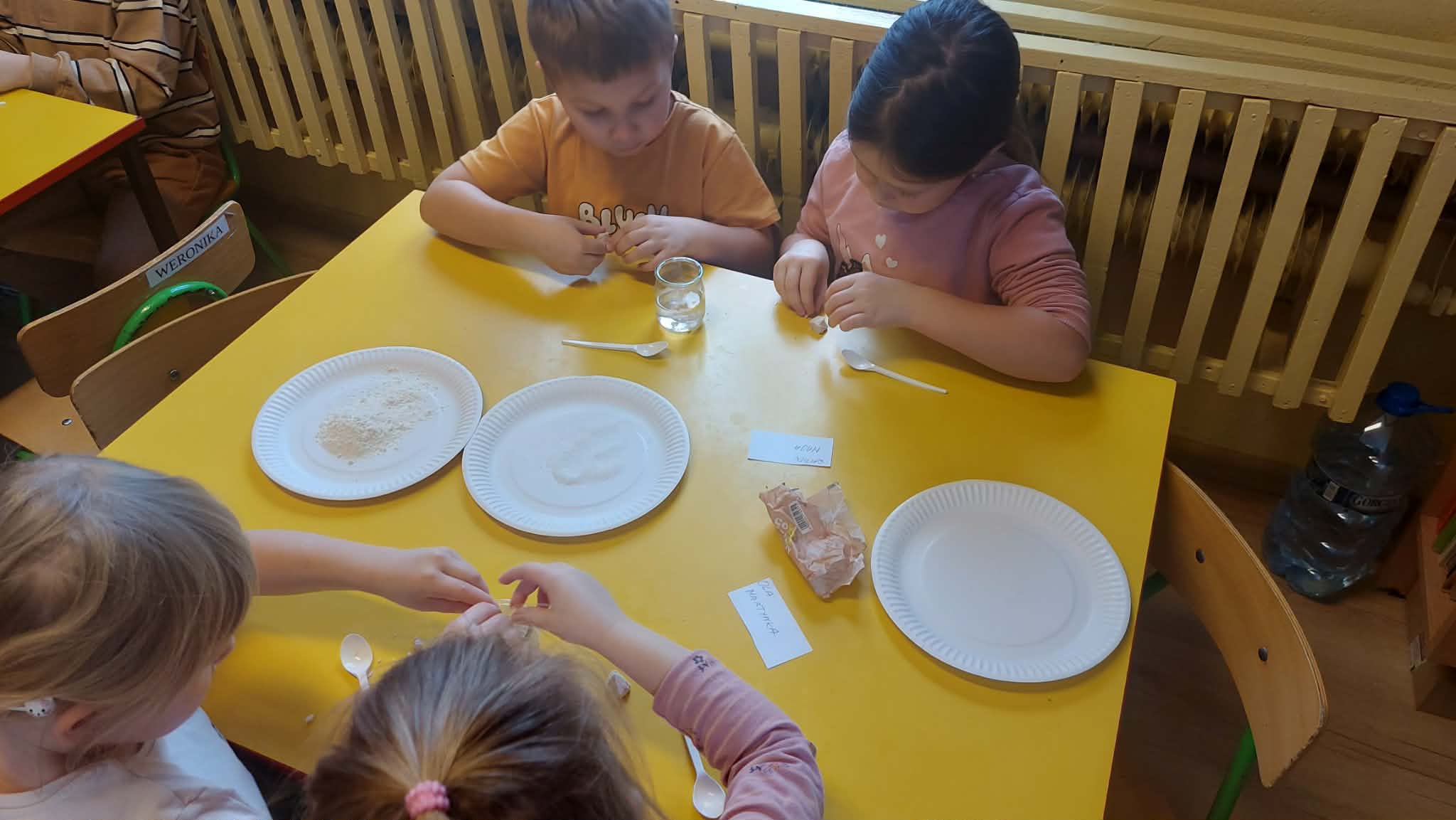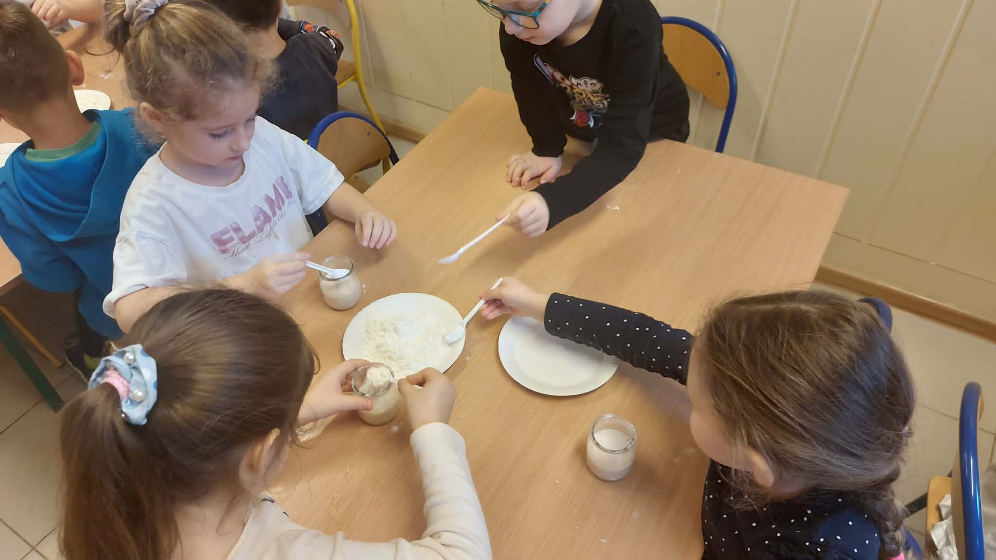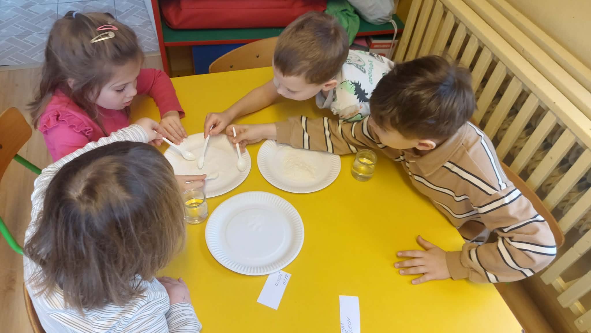 W minionym tygodniu przedszkolaki z grupy II i III wzięły udział w zajęciach sensorycznych podczas których z kilku składników tworzyły sztuczny śnieg. Podzcas ugniatania, lepienia bałwanków dzieci stymulowały zmysły dotyku, wzroku, zapachu i słuchu oraz rozwijały motorykę małą, kreatywność i wyobraźnię.